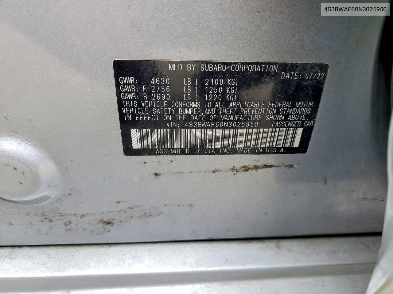 История автомобиля по VIN: 4S3BWAF60N3025950